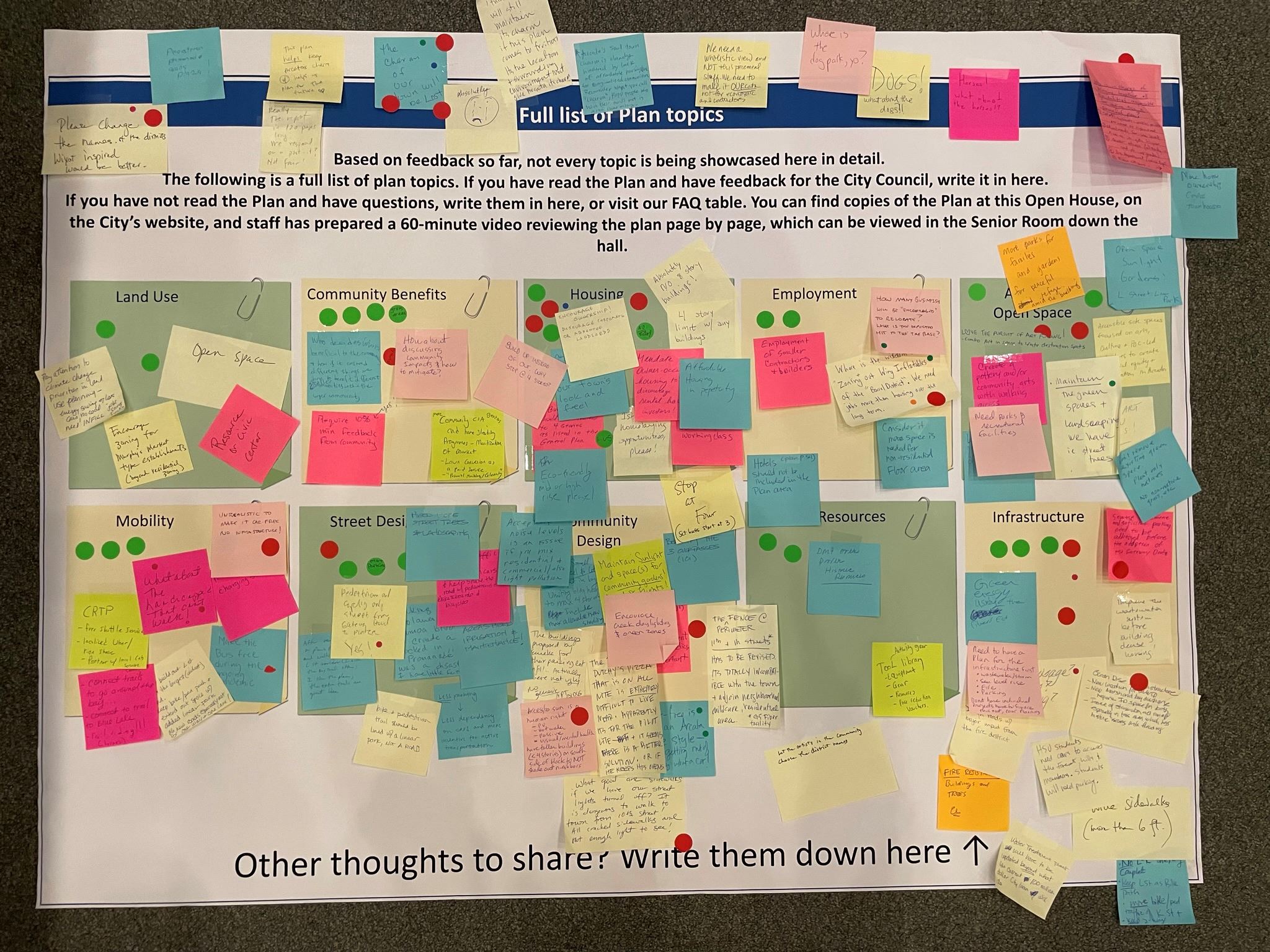 In addition to these two resources, this page houses point-in-time data from a variety of public meetings and engagement efforts, including Planning Commission and Committee public hearings, public workshops, and public surveys. Please note this page does not represent all input received on the General Plan Update. Public comment that was directed to decision makers, and public comment received on the Environmental Impact Report prepared for these policy updates, are not replicated here.